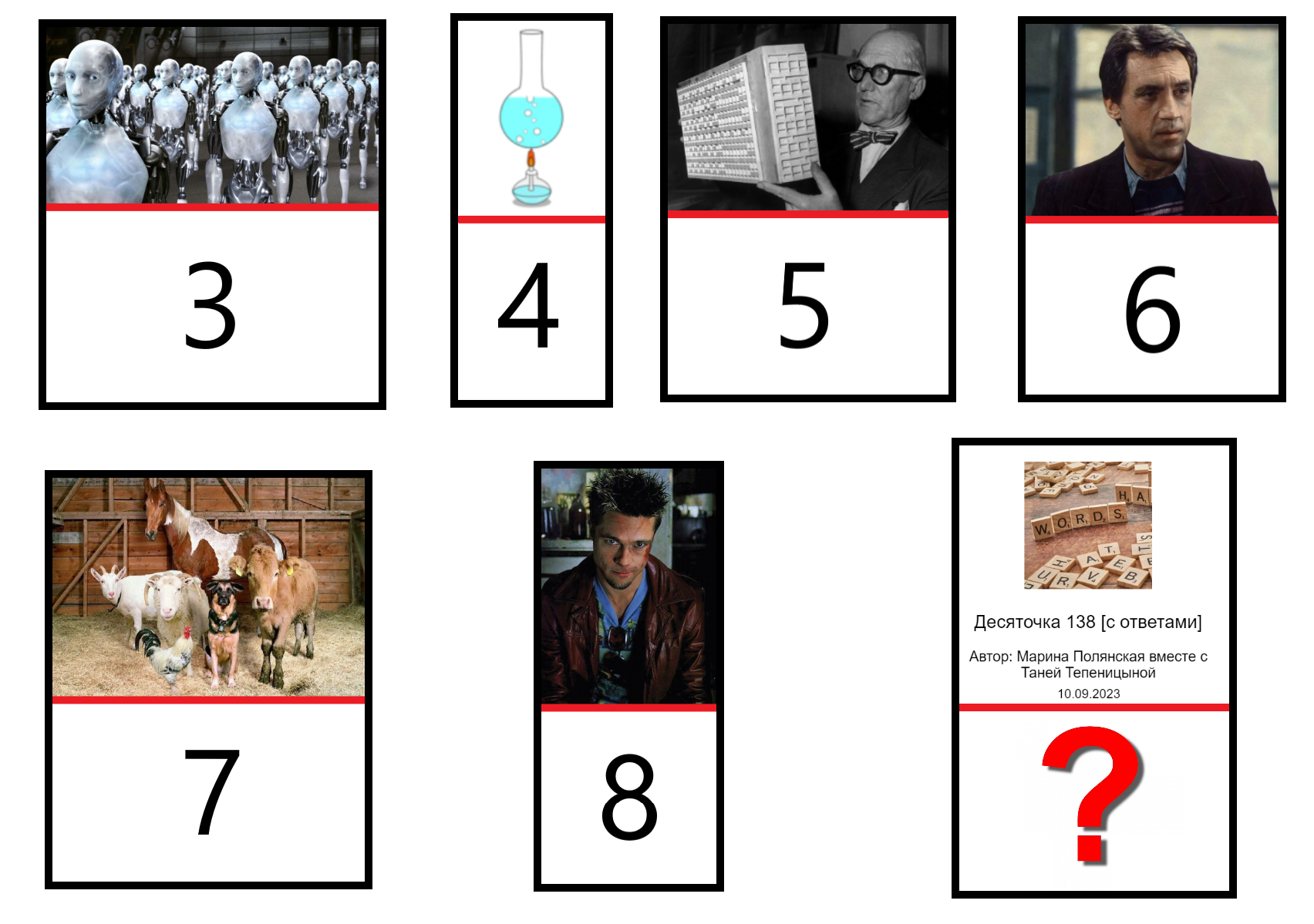 Загадано множество некоторых соотношений - пар объектов, которые относятся друг к другу одинаковым способом, а именно эти объекты отделены друг от друга красной чертой (можно считать, что это такие равные дроби).Нужно угадать логику соотношения, и либо заполнить пропущенное место в последовательности (красный вопросительный знак), либо написать общую логику, подробнее написано в каждом задании.