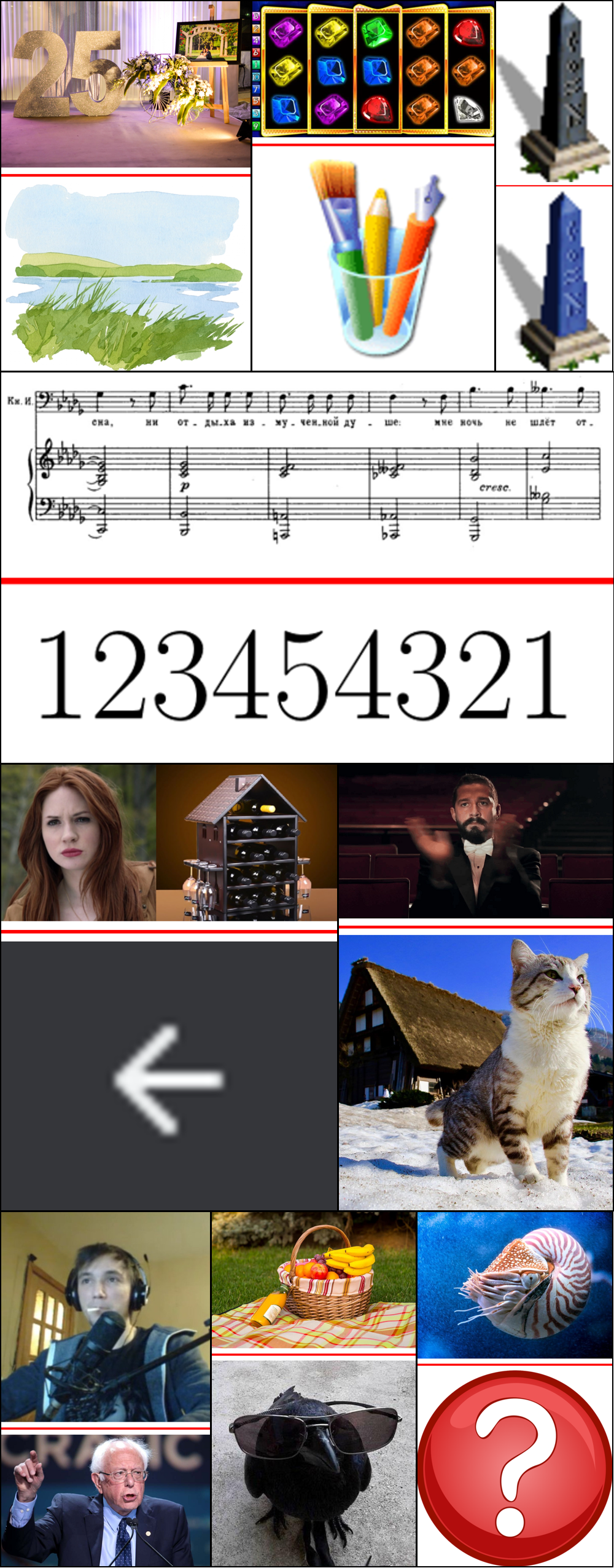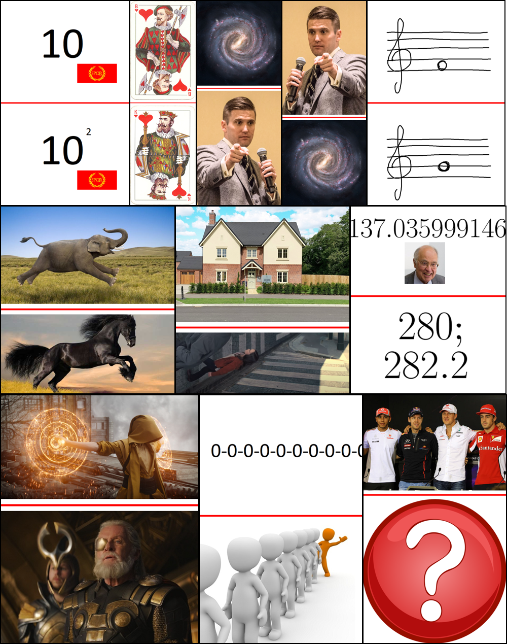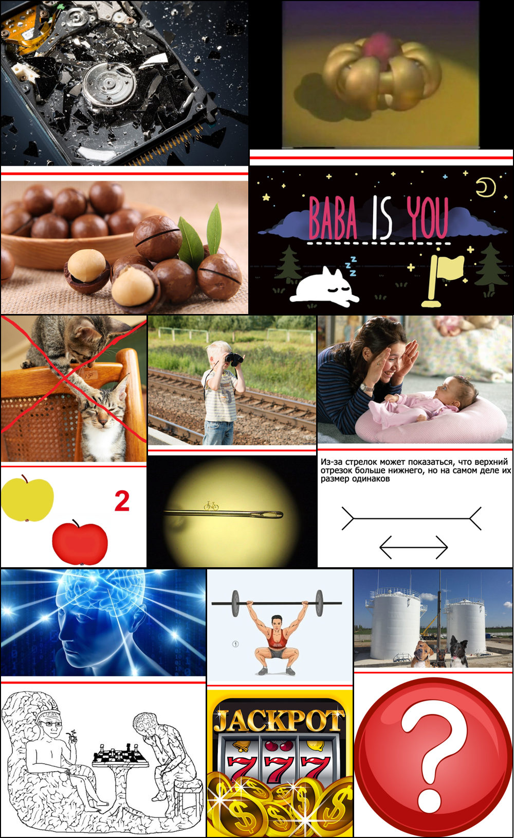 Загадано множество некоторых соотношений - пар объектов, которые относятся друг к другу одинаковым способом, а именно эти объекты отделены друг от друга красной чертой (можно считать, что это такие равные дроби).Нужно угадать логику соотношения, и либо заполнить пропущенное место в последовательности (красный вопросительный знак), либо написать общую логику, подробнее написано в каждом задании.