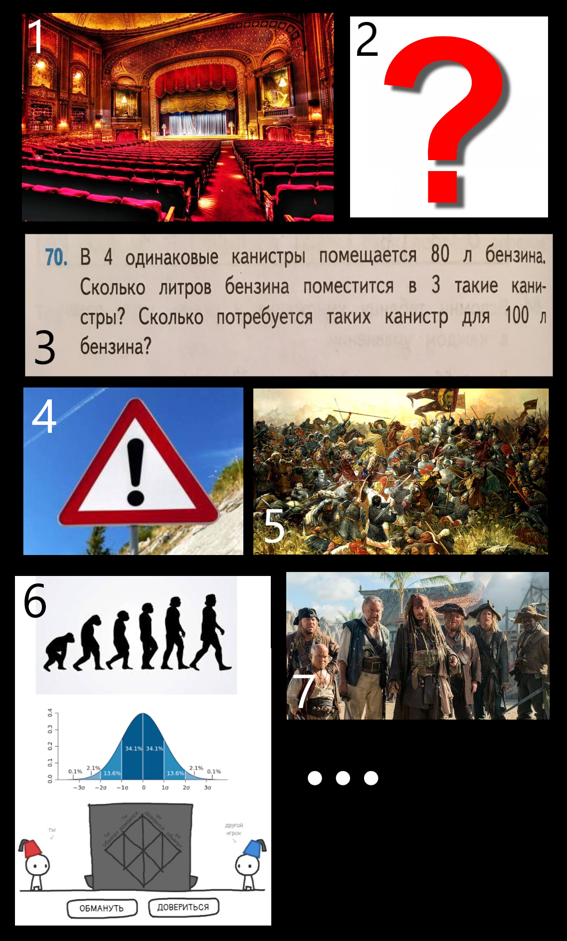 Загадана последовательность некоторых объектов. Важно, что это именно последовательность, а не просто множество - то есть важен порядок.Нужно угадать логику, по которой построена эта последовательность, и либо заполнить пропущенное место в последовательности (красный вопросительный знак), либо отгадать общую логику ее построения, подробнее написано в каждом задании.