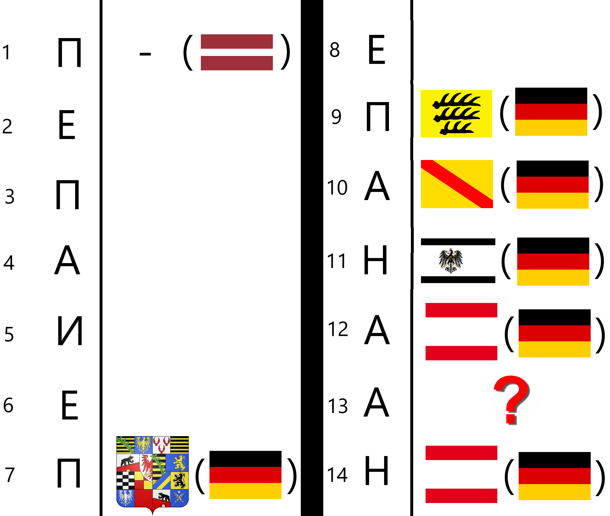 Напишите через пробел, флаг какой европейской страны пропущен и как заполнить 9 букв рядом.